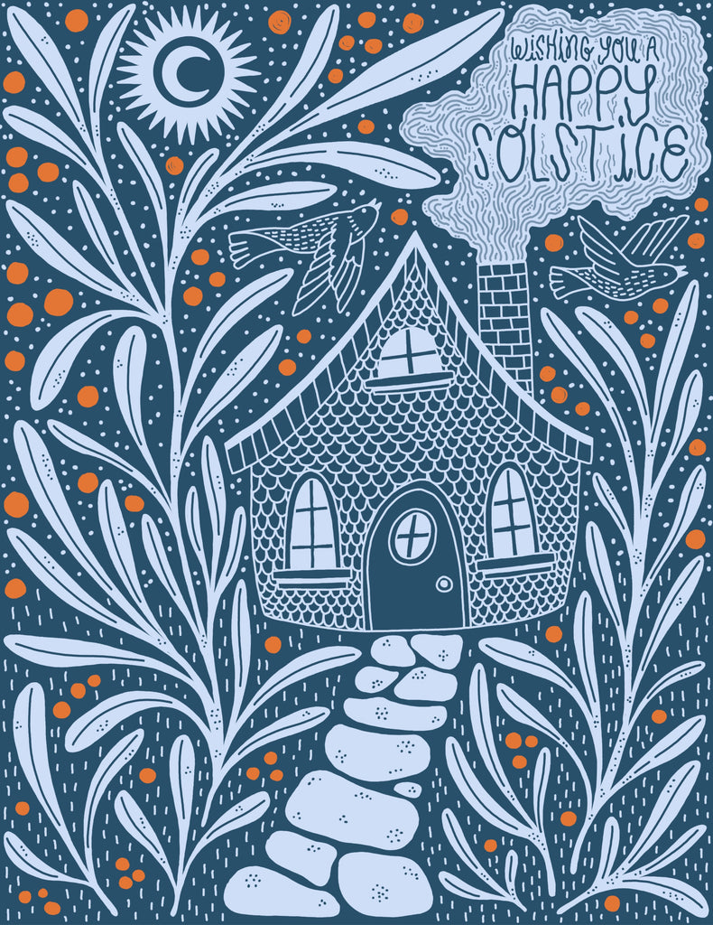 This sweet card features a cozy illustrated cottage, surrounded by holly. In the smoke coming from the chimney are the words, "Wishing You A Happy Solstice". This is the perfect card for non-religious holiday celebrations. The inside is left blank for your personal message. This card comes with high-quality brown craft envelope.