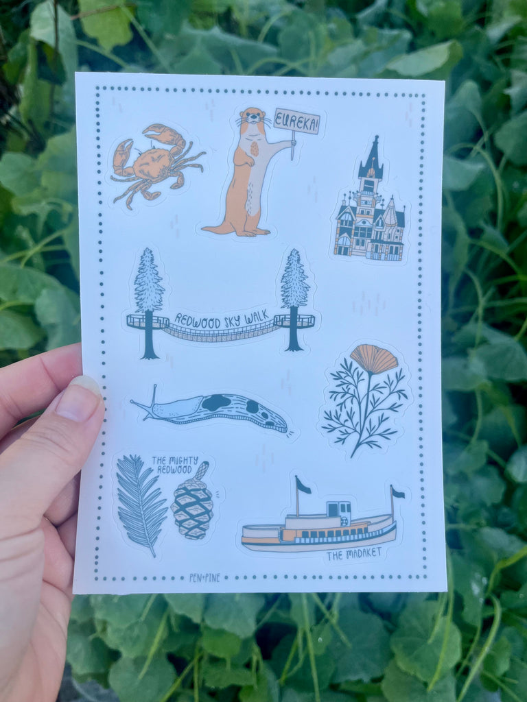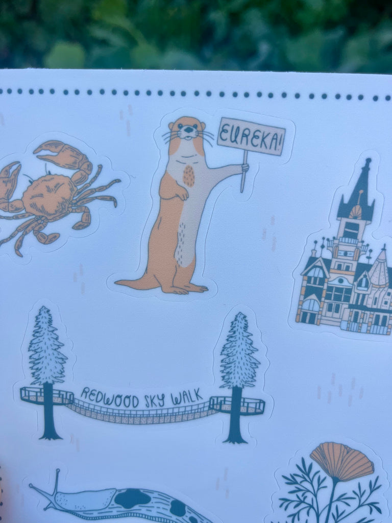 Celebrate your love of Eureka with this fun sticker sheet. Each sheet features 8 individual stickers highlighting the best of Eureka, California: a banana slug, a crab, a poppy, an otter holding a Eureka! sign, the mighty redwood, the Madaket, the Carson Mansion, and the Redwood Sky Walk.